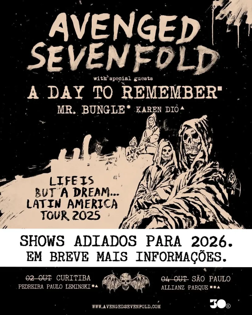 A banda Avenged Sevenfold foi obrigada a adiar os shows que faria em duas capitais brasileiras faltando pouco menos de 1 semana para o início das apresentações no País. O grupo norte-americano de heavy metal tocaria nos primeiros dias de outubro em Curitiba e São Paulo.