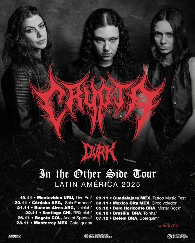 Após finalizar mais uma turnê pelos Estados Unidos, a banda brasileira Crypta anunciou um conjunto de 11 shows agendados para a América Latina. A nova turnê será realizada entre a segunda quinzena de novembro e a primeira semana de dezembro.
