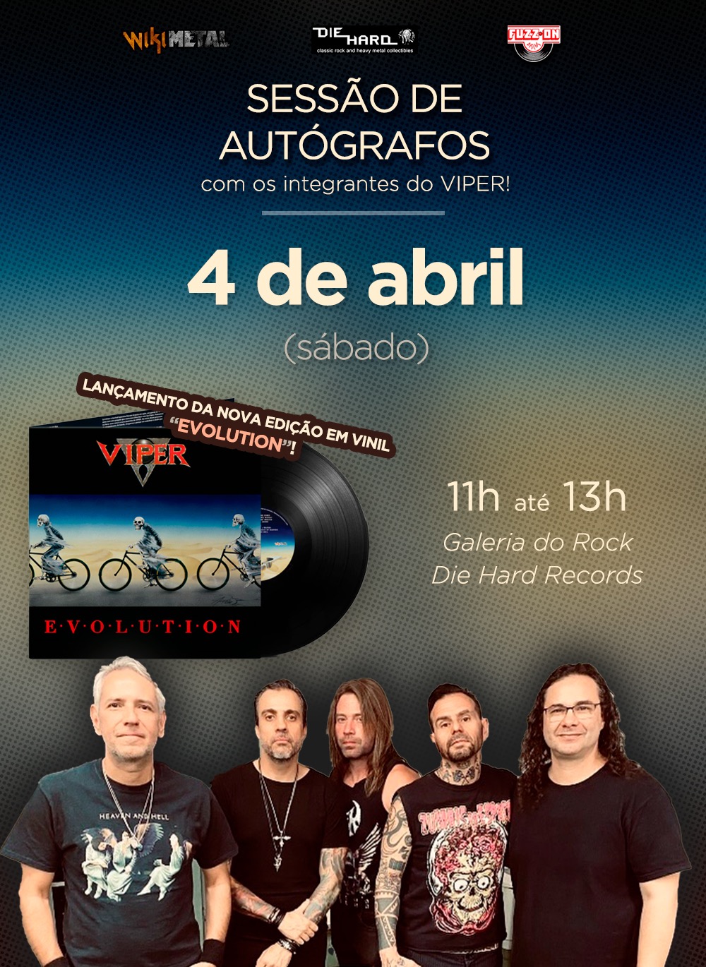 A banda Viper, pioneira do metal nacional, segue nas comemorações dos 40 anos de sua fundação revisitando seu catálogo e relançando-o e edições comemorativas. Desta vez o grupo reedita o bom disco “Evolution, o primeiro sem o vocalista André matos, que saiu em 1991 e logo depois formaria o Angra. A obra, de 1992, chega em edição especial de vinil pela Fuzz On Discos, em parceria com Wikimetal e FMLabs. Limitada a 500 cópias, com áudio remasterizado, tem capa dupla e versões picture, splatter e preto.O lançamento oficial acontece no próximo sábado, 4 de abril, das 11h às 13h, na Die Hard Records, na Galeria do Rock, no Centro de São Paulo. Os integrantes do Viper estarão no local para autógrafos e haverá ainda venda de merchandising oficial. “Evolution” marcou uma virada na história do Viper. Com Pit Passarell assumindo os vocais após a saída de Andre Matos, a banda entrou em um novo ciclo, mais direto, mais pesado e entregou o disco mais vendido de sua carreira.